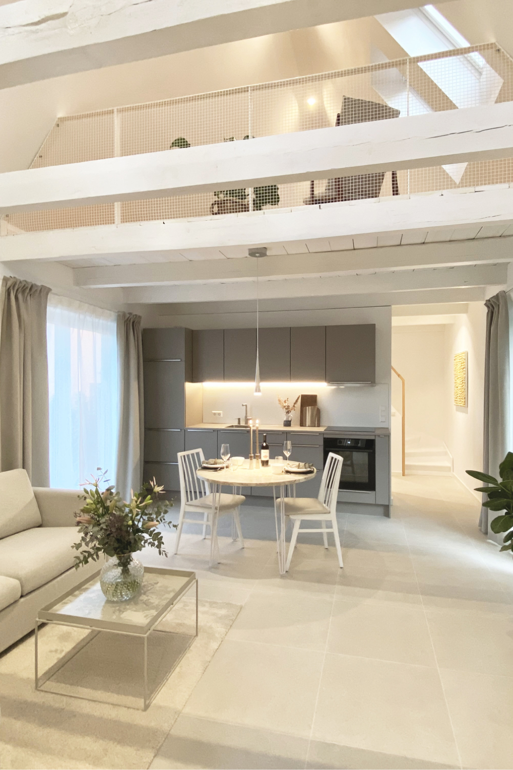 Aus dem einst kleinteiligen Grundriss wurde ein großzügiger offener Wohnbereich geschaffen, der durch Offenlegung der Balkenlage an Raumvolumen und damit Großzügigkeit gewinnt.