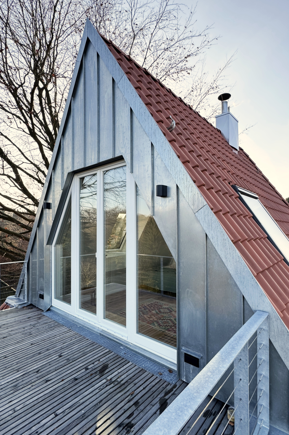 Die klassische Walmdachform wurde aufgelöst und ein neuer Giebel errichtet, wodurch ein großer neuer Schlafbereich mit Balkon geschaffen werden konnte. Zusätzlich wurde dort ein Duschbad gebaut und in diesen Zuge auch das Bad im Obergeschoss grundlegend verändert.